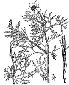Нижние листья черешковые, верхние сидячие, все пальчато-раздельные на линейные, цельные или трёхнадрезные дольки.
