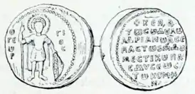 ![]() Печать Адриана Комнина с изображением Георгия Победоносца и титулами протосеваста и великого доместика. | |