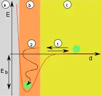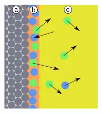 | Рис. 1: a) адсорбент, b) адсорбат, c) адсорбтив (газовая фаза или раствор) | Рис. 2: a) адсорбент, b) адсорбат, c) газовая фаза, d - расстояние, E - энергия, Eb - энергия адсорбции, (1) десорбция, (2) адсорбция |