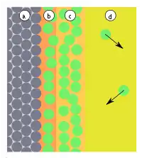 | Рис. 3: a) адсорбент, b) адсорбат, c) конденсат, d) адсорбтив (газовая фаза или раствор) | Рис. 4: a) адсорбент, b) адсорбат, c) адсорбтивы (газовая фаза или раствор): показана преимущественная адсорбция частиц голубого цвета |