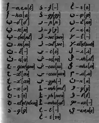 e, I ı, İ i, O o, U u, W w[3]. В 1922 году там же был издан букварь с другим вариантом латинизированного алфавита: a e i ī u o ù з v w p b f r m n l ꞁ t d s ts z dz y ç s̄ s̄s̄ j jj ȷ c cc dj dȷ q̄ q g ḡ h x x̄ k[9].