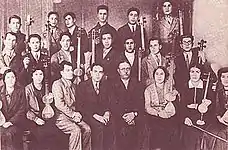 Узеир Гаджибеков среди участников созданного им нотного оркестра азербайджанских народных инструментов (1932 год)