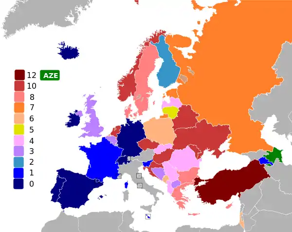 Турция. В общем за Азербайджан проголосовало 34 страны, 7 стран не отдали Азербайджану ни одного голоса.