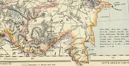 Генеральный консул Великобритании в Персии Кит Эбботт сообщал в 1863 году, что «страна, известная персам как Азербайджан, поделена между ими и Россией, при этом последней принадлежит около пяти восьмых от общей площади, которая по грубым оценкам занимает территорию приблизительно в 80,000 квадратных миль, или примерно соответствует размеру Великобритании; таким образом, 50,000 квадратных миль — это протяженность части, принадлежащей России, и 30,000 остается за Персией».[18]