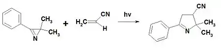 Фотолиз азиринов (длина волны менее 300 нм) является очень эффективным методом генерации 1,3-диполярных нитрил-илидов. Эти илиды вступают в реакции с различными диполярофилами с образованием гетероциклических соединений, например 1-пирролинов.
