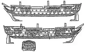 | Общее число орудий | 80 орудий (4×40-фн единорога, 24×36-фн пушек, 30×24-фн пушек, 22×24-фн карронады)[5] |