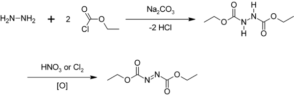 Отвечающий азодикарбоновой кислоте диэтиловый эфир получен в виде оранжево-желтого масла, кипящего при 106 °С (13 мм рт.ст.), окислением азотной кислотой соответствующего гидразодикарбонового эфира (температура плавления 130 °С, температура кипения с разл. около 250 °С), образующегося из этилхлорформиата и гидразина[1]: