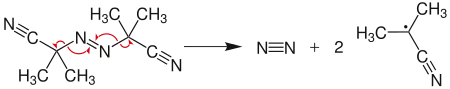 Алифатические азосоединения при нагревании или при облучении ультрафиолетом разлагаются с выделением азота и образованием свободных радикалов, поэтому некоторые из них, в частности, 2,2'-азо-бис-изобутиронитрил, разлагающийся при 60—100 °C, используются в качестве инициаторов радикальной полимеризации: