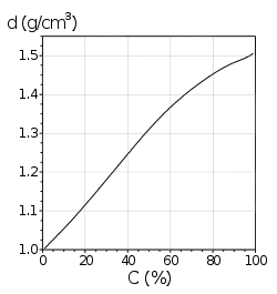 где d — плотность в г/см3, c — массовая доля кислоты. Данная формула плохо описывает поведение плотности при концентрации более 97 %.