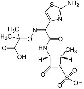 | ИЮПАК | [2S-[2α,3β(Z)]]-2-[[[1-(2-Амино-4-тиазолил)-2-[(2-метил-4-оксо- 1-сульфо-3-азетидинил)амино]-2-оксоэтилиден]амино]окси]-2-метилпропановая кислота ([2S-[2α,3β(Z)]]-2-[[[1-(2-Amino-4-thiazolyl)-2-[(2-methyl-4-oxo-1-sulfo-3-azetidinyl)amino]-2-oxoethylidene]amino]oxy]-2-methylpropanoic acid) |