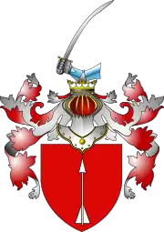 В красном поле серебряная стрела остриём вверх. В клейноде выходящая рука в железном наруче с мечом в золото оправленным, вправо.