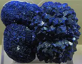 Азури́т, также называемый медная лазурь (фр. azur — лазурь) Cu3(СО3)2(ОН)2 — минерал синего цвета со стеклянным блеском, хрупкий. Тв. 3,5—4. Цвет черты синевато-голубой, спайность совершенная, излом раковистый. Один из наиболее распространённых вторичных минералов, содержащих медь. Индикатор и поисковый признак медных руд, азурит и сам является медной рудой, хотя и менее ценной, чем малахит.