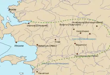 | Крупнейшие города | Смирна, Бирги, Аясолук, Алашехир (Филадельфия), Тире, Айдын (Тралл), Султанхисар, Келес (Кираз) |