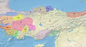 ![]() Бейлики Малой Азии в 1308 году. * A Трапезундская империя * B Византийская империя * D Киликийская Армения * E Государство сельджуков * 1 Чобаногуллары * 2 Караманогуллары * 3 Инанчогуллары (Ладик) * 4 Сахиб-атаогуллары * 5 Перванеогуллары * 6 Ментешеогуллары * 7 Эшрефогуллары * 8 Джандарогуллары * 9 Карасыогуллары * 10 Османогуллары * 11 Гермияногуллары * 12 Хамидогуллары * 13 Саруханогуллары * 14 Айдыногуллары |