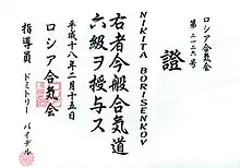 | 2-й дан | ни-дан | фукусидоин | 18 лет | 2 года после 1 дана | написание статьи об айкидо, техника против ножа |