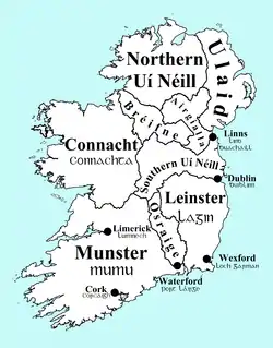 ![]() Ирландия в раннем средневековье. Показаны основные королевства. Королевство Айлех было одним из королевств во владениях северных О’Нейлов. |