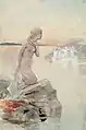 - справа изображена скорбная Айно, плачущая на берегу и слушающая зов служительниц Велламо, пляшущих в воде;