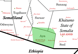 Айн имеет границу с Эфиопией, из-за чего возникают приграничные конфликты на его территории, так как Эфиопия является союзником Сомалиленда в регионе. С мая по июль 2010 года по инициативе Эфиопии происходил серьёзный вооруженный конфликт между сомалилендско-эфиопскими формированиями и милициями Сул-Санааг-Айна рядом с городом Уидвид. Почти вся территория Айна на данный момент контролируется Сул-Санааг-Айном, власти которого создали свою автономию Хатумо.