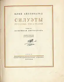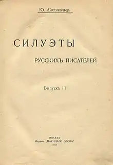 - Айхенвальд Ю. И. Силуэты русских писателей, выпуск I — М., 1906; изд. 2-е — М., 1908; изд. 3-е — М. 1911; изд. 4-е — М. 1914; изд. 5-е. — М. 1917. Выпуск III. — М. 1907—1910, Вып. III. 2-е доп. изд. М., Мир, 1913. Все три выпуска впервые объединены в издании «Силуэты русских писателей» — М., Республика, 1994.