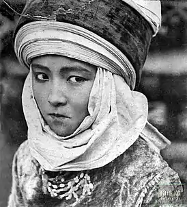 ![]() Айша Карасаева (Тюменбаева) на съёмках фильма «Крытый фургон», 1927 год | |