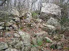 Укрепление находится на вершине конусовидной горы, окружённой двумя рядами стен (толщина 1,5—2 м, кое-где сохранились на высоту 1,7—2 м), сложенных из бута на глине, или насухо. Площадь крепости около 0,37 гектара, стены шли по всему периметру, въезд располагался с южной стороны[1]. В восточном углу внутренней крепости, на вершине нагромождения скальных глыб, находится храм, его апсида была вмонтирована в стену и выполняла роль крепостной башни. Пространство между внутренней и внешней стеной было тесно застроено, за пределами укрепления, раскопками Елены Александровны Паршиной 1969 года, открыты остатки крупной винодельческой усадьбы (полностью снесённой в 1957 году при закладке виноградника), крепиды террасных виноградников. Паршиной также был вскрыт фундамент довольно большого одноапсидного храма XII—XV века, как она полагала, построенного на остатках более раннего (по находкам керамики его относили к VIII—X веку). На основании находок было сделано заключение об укреплённом монастыре XII—XV века[4], современная версия предполагает наличие предшествующего монастырю замка или укреплённого поселения[1]. Считается, что монастырь, как и многие другие укрепления, был восстановлен в XIII веке в связи с татаро-монгольскими вторжениями в Крым (начиная с 1223 года), сельджукской экспансией и переходом горного Крыма в зону влияния Трапезундской империи[5]. Монастырь существовал в составе Капитанства Готия генуэзских колоний и, судя по исследованиями последних десятилетий, погиб в пожаре 1475 года при захвате Готии армией Гедик Ахмед-паши[6][7]