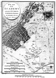 Словом «академия» именовалась философская школа, которая была основана Платоном в 387 году до н. э. и располагалась в одноимённом саду (священная оливковая роща) около города Афины. Местность была так названа в честь мифического героя Академа (Ἀκάδημος)[2][3].