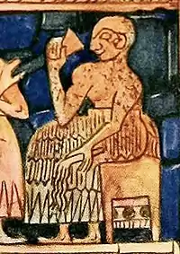![]() Изображение восседающего на троне царя. Фрагмент доски для игры, найденной в гробнице PG 1332 на царском кладбище в Уре. Гробница PG 1332, как полагают, принадлежит царю Акаламдугу | |