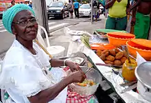 Акараже (порт. acarajé) — блюдо из очищенного коровьего гороха, которому придаётся круглая форма и которое затем жарится на пальмовом масле, одно из традиционных блюд бразильской и нигерийской кухни. В качестве начинки и дополнительных ингредиентов могут служить жареные креветки, орехи кешью, салат, зелёные и красные помидоры, острый перечный соус, фасоль, имбирь, чеснок и так далее[2].