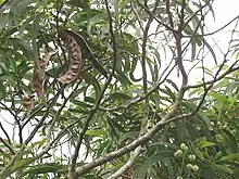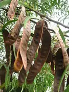 Бобы 7—15 см длиной и шириной 1,5—2,5 см, содержат в среднем по 12 семян, при созревании становятся коричневым.