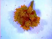 Цветки серовато-жёлтые, очень мелкие, пахучие, собраны по 20—30 в шаровидные головки диаметром 4—8 мм; головки собраны в кистевидные соцветия, которые в свою очередь собраны в метёлки. Чашечка колокольчатая, пятизубчатая. Венчик пятилепестный; лепестки широколанцетные или яйцевидные, заострённые. Тычинки многочисленные, свободные, на длинных жёлтых или оранжевых нитях, далеко выступающих из венчика. Пестик с верхней одногнёздной завязью, длинным столбиком и небольшим рыльцем. Столбик, как и тычинки, сильно выдаётся из венчика.
