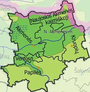 - 3 города — Акмяне, Науйойи-Акмяне и Вянта;