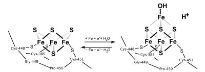 Митохондриальная аконитаза, содержит остатки цистеина в позициях -385, -458 и -451, а также железосерный кластер [4Fe-4S], который имеет решающее значение для её каталитической активности. В неактивном состоянии в кластере отсутствует четвёртый атом железа, который слабо связан и первоначально имеет координационное число 4 (тетраэдрическая структура): три атома серы и один ион гидроксида (воды) в качестве связующего партнёра (см. Рисунок). В каталитической фазе координационное число атома железа увеличивается до 6 (октаэдрическая структура), а затем присоединяется дополнительный изоцитрат и другая молекула воды[5].