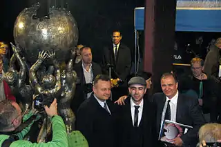 По инициативе административного директора «Коллегиум Полоникум» профессора Кшиштофа Войцеховского создал первый в мире памятник Википедии[7][8], изображающий четыре человеческие фигуры, удерживающие официальный логотип Википедии — «глобус», составленный из пазлов, верхняя часть которого не закончена. Памятник высотой около 2,5 м изготовлен из синтетической резины, армированной стекловолокном. Установлен на Франкфуртской площади польского города Слубице, недалеко от реки Одер, отделяющей его от германского Франкфурта-на-Одере.