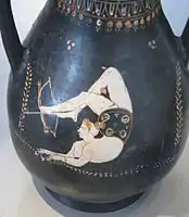 Женщина-акробат изображена на древнегреческой гидрии, около 340-330 до н. э.