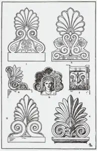 Традиция украшать фронтоны не только скульптурами в тимпанах, но и снаружи — на вершине и по краям треугольника, образуемого гейсонами (карнизами) — берёт начало в античной архитектуре. На вершине фронтона ставили украшение из расходящихся в стороны листьев — пальметт. Их симметрия соответствовала симметрии треугольного фронтона. По углам устанавливали угловые, двусторонние пальметты, согнутые под прямым углом так, чтобы они хорошо читались как с главного, так и с бокового фасада здания. Их называли полуакротериями. Те и другие изготавливали из мрамора или терракоты и устанавливали на специальных подставках с горизонтальными площадками[9]. В отдельных случаях на таких площадках устанавливали скульптурные изображения грифонов или сфинксов.