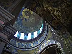 ![]() Изображение Аксайской иконы Божией Матери в Новочеркасском соборе в барабане главного купола среди медальонов с изображениями особо чтимых икон Богородицы | |