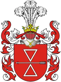 | W polu barwy niewiadomej, prawdopodobnie czerwonej, dwa trójkąty wierzchołkami złączone, przez połączenie przechodzi strzała żeleźcem w prawo. Nad helmem w koronie trzy pióra strusie. (польск.) | В поле цвета неизвестного, вероятно червоного, два треугольника вершинами соединённые, через соединение проходит стрела наконечником вправо. Над шлемом в короне три пера страусовых. | |||