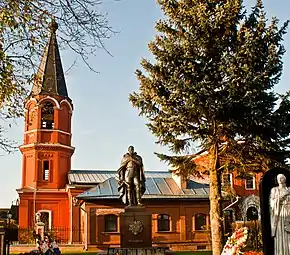 ![]() Аксиньинский храм и памятник на братской могиле советских солдат | |