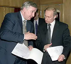 ![]() Николай Аксёненко (слева) на совещании с Путиным В. В. (2001) | |