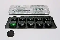 Активи́рованный у́голь — пористое вещество, которое получают из различных углеродосодержащих материалов органического происхождения: древесного угля (марки активированного угля БАУ-А, ОУ-А, ДАК[1] и др.), каменноугольного кокса (марки активированного угля АГ-3, АГ-5, АР и др.), нефтяного кокса, скорлупы кокосовых орехов и других материалов. Содержит огромное количество пор и поэтому имеет очень большую удельную поверхность на единицу массы, вследствие чего обладает высокой адсорбционной способностью. В зависимости от технологии изготовления, 1 грамм активированного угля может иметь поверхность от 500 до 2200 м²[2]. Впервые синтезирован Николаем Дмитриевичем Зелинским (1915 г.), использован им в противогазах как универсальное средство химической защиты[3], а позже — в качестве гетерогенного катализатора. Применяют в медицине и промышленности для очистки, разделения и извлечения различных веществ.