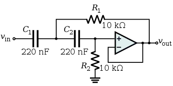 Пример активного фильтра высоких частот. Операционный усилитель U1 используется в качестве повторителя напряжения.
