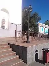 | Лоджия с колоннадой фасада (вид спереди) | Статуя в нише фасада театра | Декоративная ограда и фонарный столб |