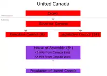 Новая объединённая колония была названа провинцией Канада, а местопребывание правительства перенесено лордом Сиденхемом в Кингстон. Верхняя Канада стала неофициально называться Западом Канады, а Нижняя Канада — Востоком Канады. Запад Канады с населением 450 000 жителей был представлен 42 креслами в Законодательном собрании, и то же самое число кресел закреплялось за более населённым Востоком Канады с 650 000 жителей. Франкоязычное большинство и многочисленные англоговорящие считали, что это несправедливо. Депутат от Нижней Канады Луи-Жозеф Папино, войдя в новый Парламент Соединённой Канады, сразу же потребовал представительства в зависимости от населения и упразднения союза.