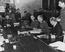 Слева направо: Вильгельм Оксениус (переводчик и помощник Йодля), Йодль, Фридебург; стоит Карл Спаатс (глава разведуправления SHAEF)