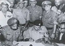 ![]() Командующий пакистанскими войсками в Восточном Пакистане генерал-лейтенант Амир Ниязи подписывает Акт о капитуляции | |