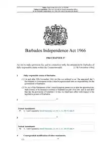Акт о независимости Барбадоса был провозглашён парламентом Великобритании в 1966 году. Данный закон предоставлял независимость Барбадосу от Великобритании, который на тот момент был частью её колоний. Закон предусматривал предоставление новой конституции, которая вступила в силу после провозглашения независимости.