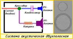 - 2-полосная схема (НЧ/СЧ + ВЧ динамик)