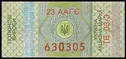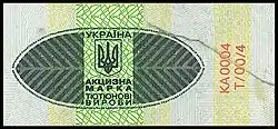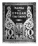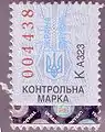 - Вверху горизонтальная надпись «контрольна марка»; под ней слева трезубец размером 3 × 3 квадрата с вертикальной справа от него надписью «Украина», также высотой 3 квадрата.