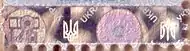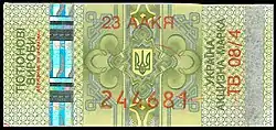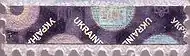 - С обеих сторон трезубца марку пересекает горизонтальная полоса на 3 квадрата ниже верхнего края марки. Под полосой идут 8 полных горизонтальных бегущих строк «україна україна ukraine ukraine» (на украинском и английском языках, по два слова подряд на одном языке) общей высотой 4½ квадрата.