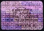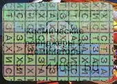 - Прямоугольник из 10½ расчерченных квадратов по горизонтали и семи квадратов по вертикали; в каждой строке по вертикали слово «захист» («защита») бегущей строкой («захистзахистз…»); каждая строка на разном уровне.